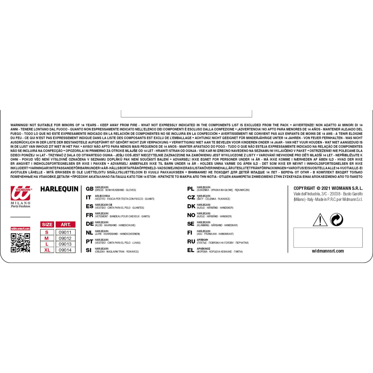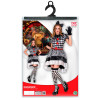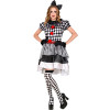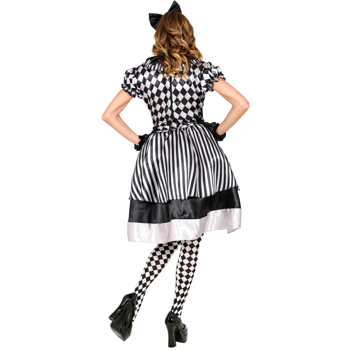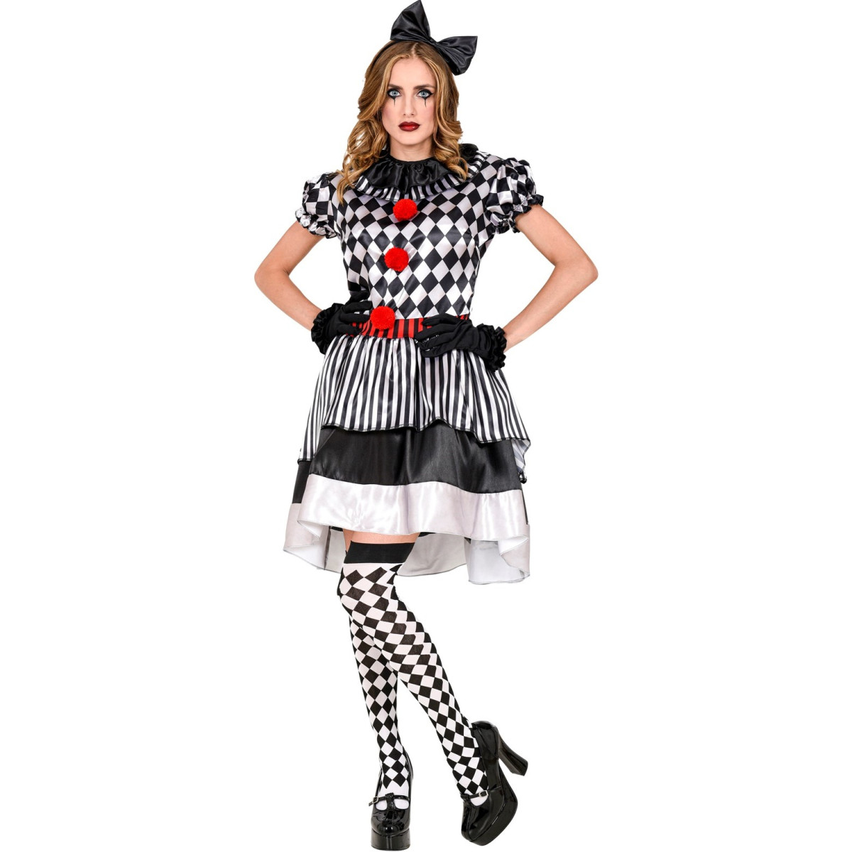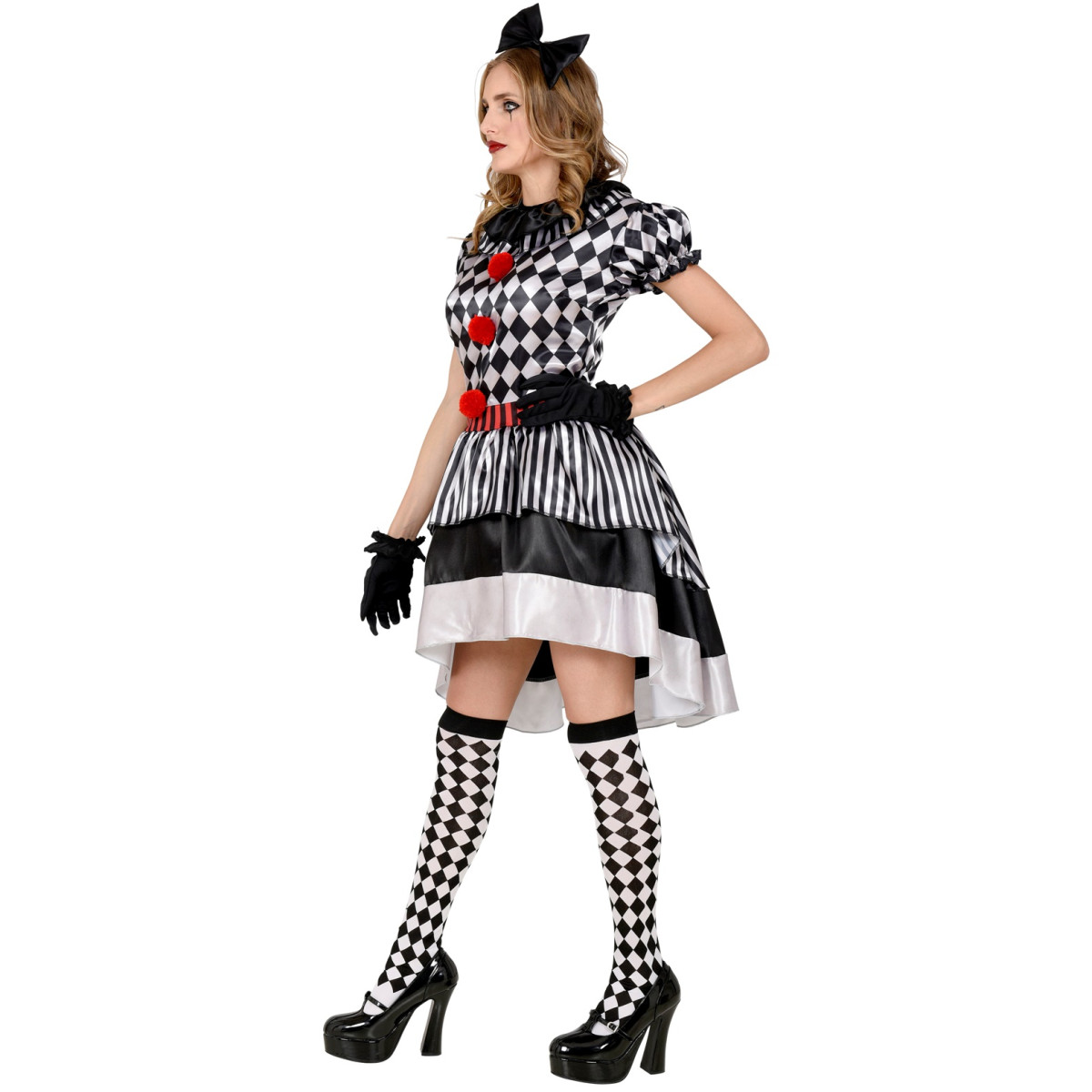 Dámský karnevalový kostým klaunky se skládá z půvabných šatů zdobených klasickým černo-bílým kostkovaným vzorem. Šaty mají krátké nabírané rukávy a vícevrstvou sukni nad kolena s černo-bílými pruhy a červenými detaily, které dodávají živý nádech. Součástí kostýmu je také černá čelenka s velkou mašlí a černé rukavičky.