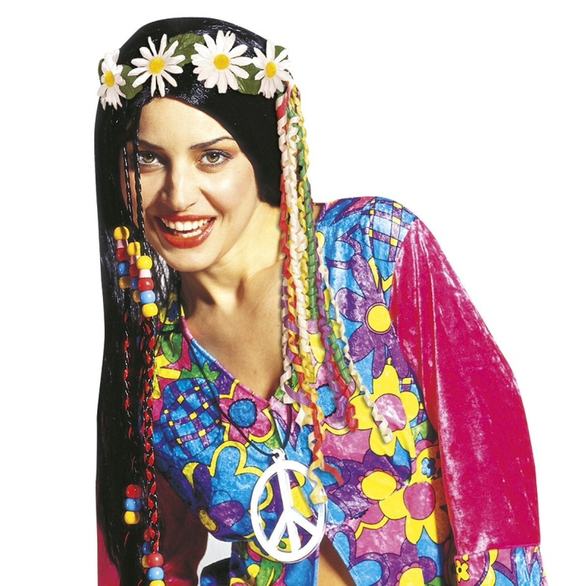 Věneček do vlasů s kopretinami je dokonalým doplňkem k hippie kostýmu, který dodá autentický retro nádech z éry hippie hnutí. Věneček má univerzální obvod, takže pasuje většině velikostí hlavy, a je ozdoben množstvím bílých kopřetin, které zaručeně dodají vašemu outfitu hravost a pestrost.