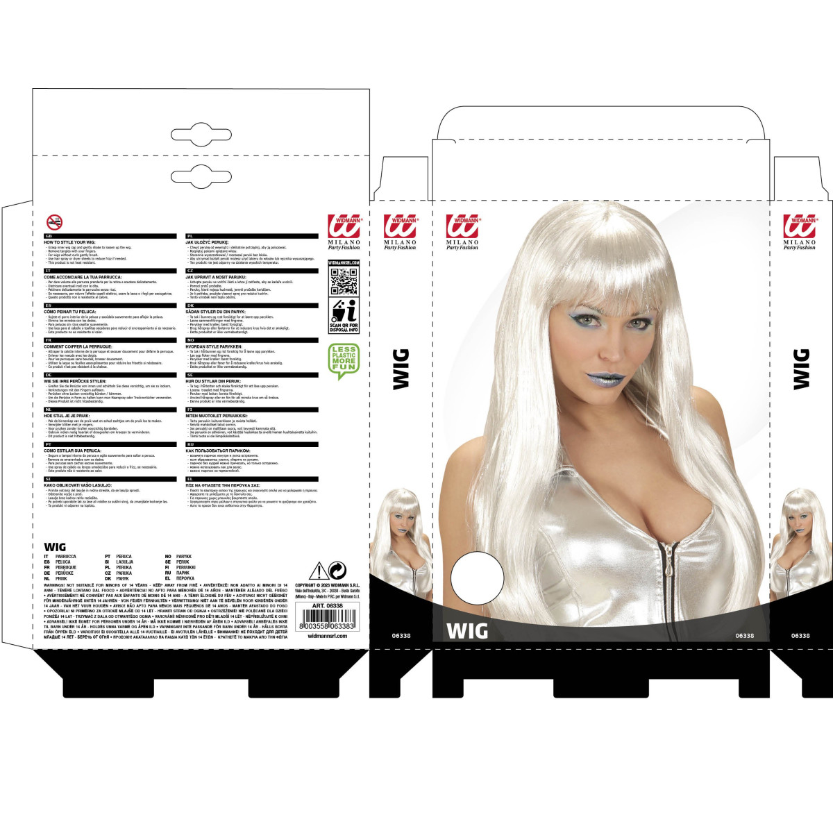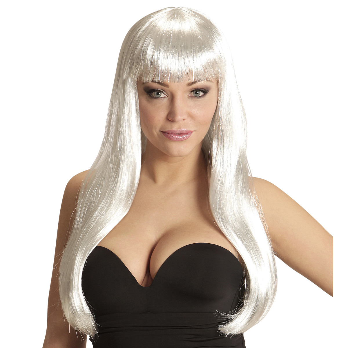 S touto nádhernou dlouhovlasou parukou můžete změnit svou image během pár vteřin. Dlouhá dámská paruka sahá lehce přes ramena, bílé rovné vlasy doplňuje ofina. Ideální na karneval, rozlučku se svobodou, festival nebo klubovou párty. Přátelé vás možná ani nepoznají! Perfektní účes pro čarodějnice, anděly i ledové princezny.