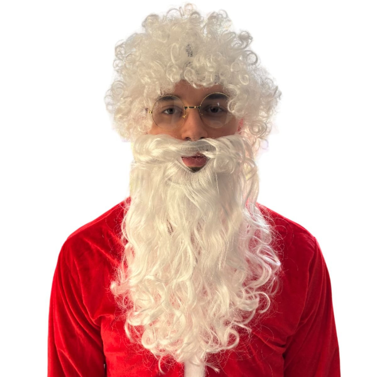 Paruka a vousy pro Santu jsou v bílé barvě. Paruka je vyrobena z kudrnatých vláken, zatímco vousy mají délku přibližně 30 cm. Vousy mají otvor pro ústa, což umožňuje snadné mluvení – ideální při rozdávání dárků. Díky gumičce se vousy snadno a bezpečně nasazují kolem hlavy, což zajišťuje pohodlné a stabilní nošení.