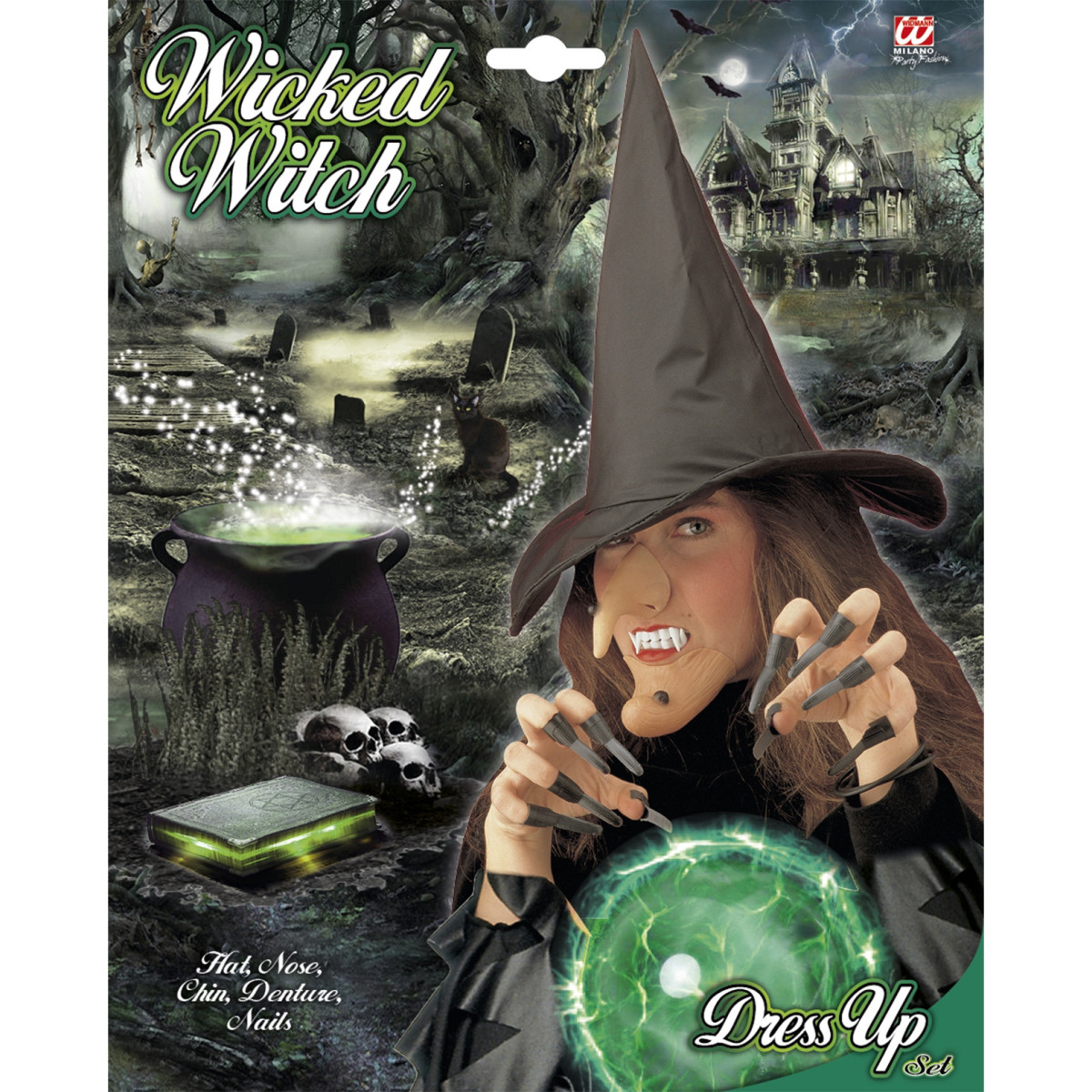Sada pro čarodějnici obsahuje: klobouk, nos, bradu, zuby a nehty.