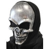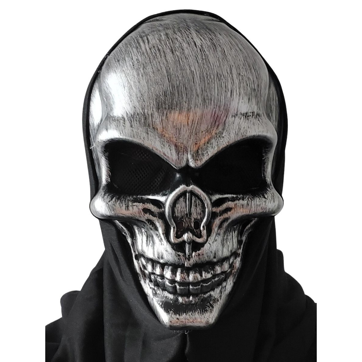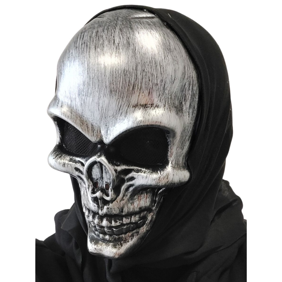 Stříbrná maska lebky na Halloween zaujme svým lesklým, moderním vzhledem. Vyrobena je z odolného PVC materiálu, který se dobře přizpůsobí obličeji. Připevněná kapuce zajišťuje pohodlné nošení a dotváří realistický vzhled lebky. Přes oči je natažená černá síťka, která dodává masce tajemnou atmosféru. Tato maska je perfektní volbou pro Halloween – zaručeně přitáhne pozornost a navodí děsivě vzrušující dojem.