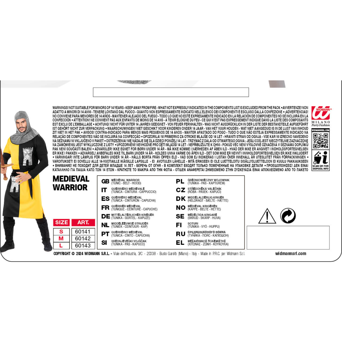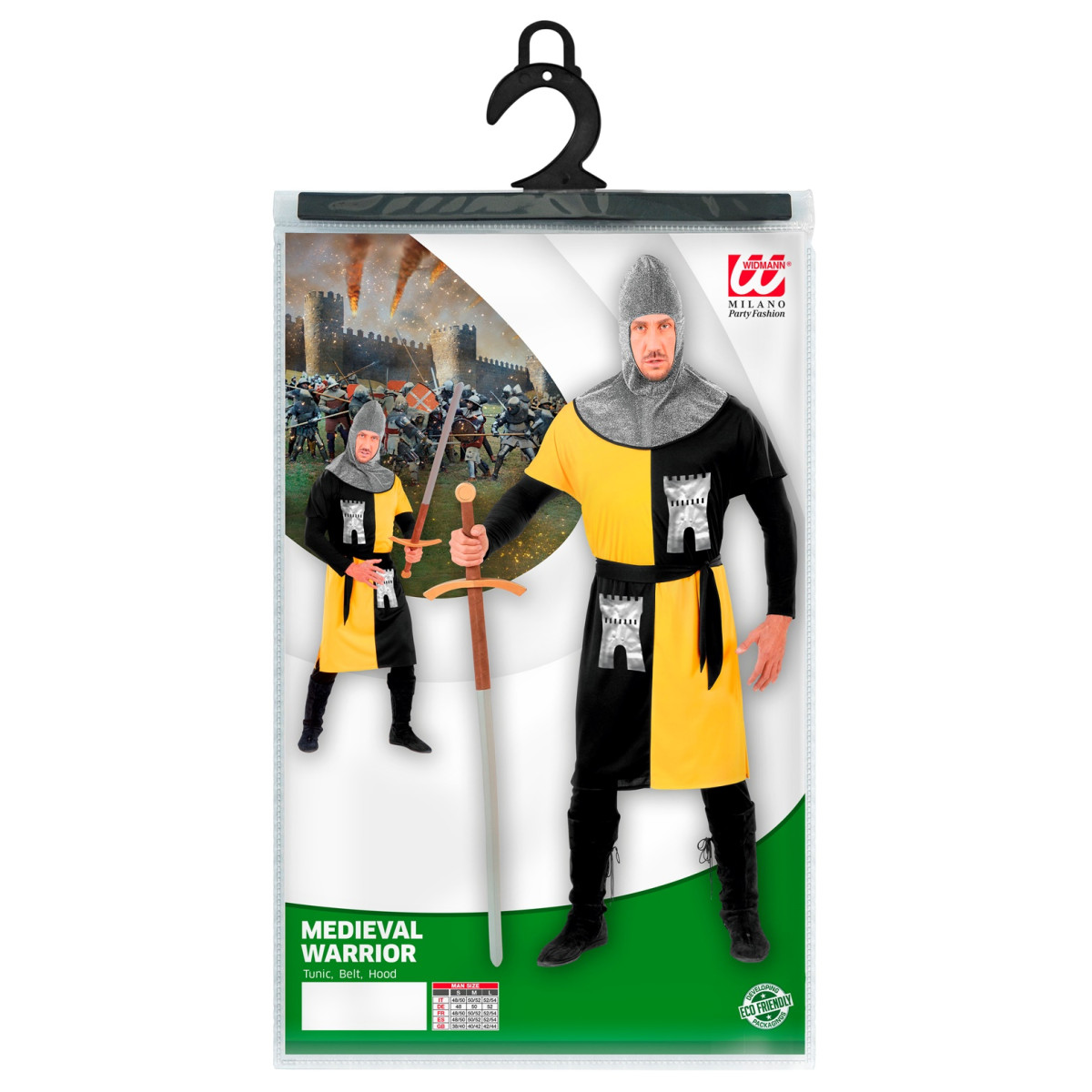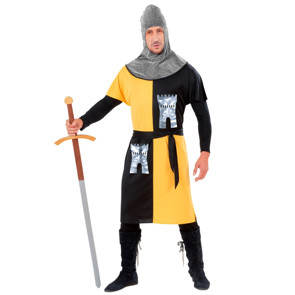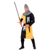 Hlavní částí tohoto impozantního kostýmu je černo-žlutá tunika, která sahá ke kolenům a zdůrazňuje vaši postavu. Je vyrobena z kvalitního materiálu, jenž zajišťuje pohodlí i volnost při nošení. Na přední straně tuniky je vyobrazen hrad, symbol síly a pevnosti rytířského řádu. Součástí kostýmu je také pásek a pokrývka hlavy, která zakrývá hlavu i krk a sahá až k ramenům, takže se můžete plně vžít do role rytíře.