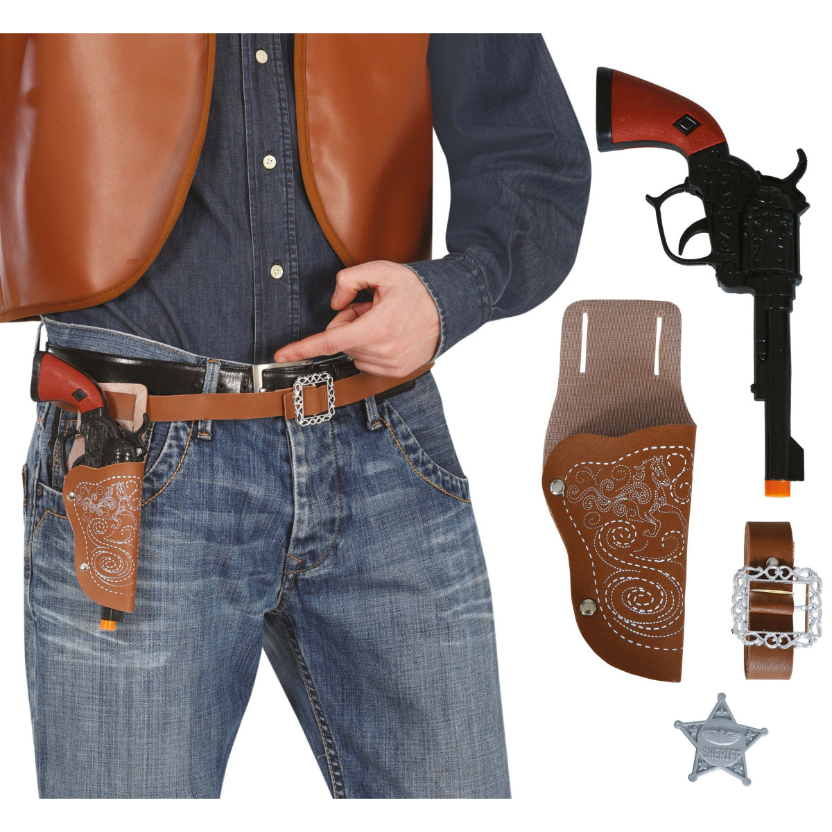 Sada pro kovboje obsahuje pistoli o délce 24 cm, opasek s pouzdrem a šerifskou hvězdu pro autentický kovbojský zážitek. Realistický vzhled zajistí dětem spoustu zábavy při hrách na role i karnevalových dobrodružstvích.