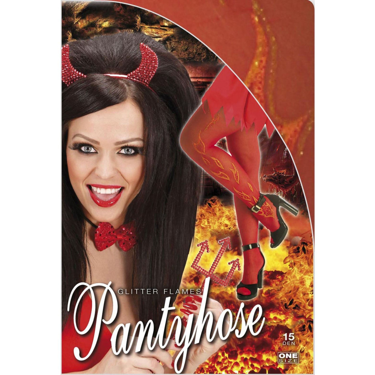 Červené ponožky pro dospělé mají doslova ďábelský vzhled – od kotníku ke kolenu zdobí motiv ohně. Zlaté plamínky se jemně třpytí. Skvělá volba ke kostýmu čertice! Červené ponožky, dámské.
