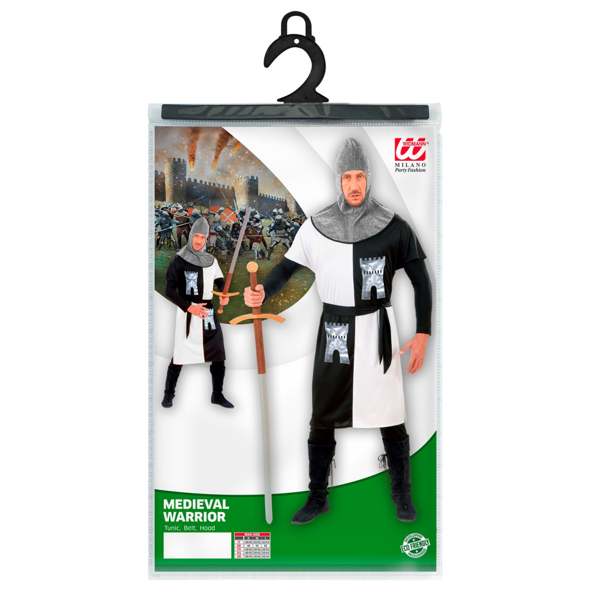 Výjimečný kostým rytíře křižáka inspirovaný odvahou středověkých bojovníků. Součástí je černo-bílá tunika se symbolem pevnosti, pásek a pokrývka hlavy, která zakrývá hlavu, krk i ramena. Kostým je vyroben z pohodlného, elastického materiálu a je dostupný ve velikostech S, M a L. Perfektní volba na večírky, tematické akce i divadelní představení – vžijte se do role rytíře a zažijte pravé středověké dobrodružství!